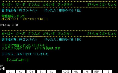 昔あったゲーム会社のコンパイルが出してたPCゲームで使われていたサウンドドライバのFPLAY,BPLAYは手打ちで入力するときに何か入力すればコメントが出たなーと最近思い出したので実践してみました。記憶を頼りにディスクステーション98の#20の中に入ってい…