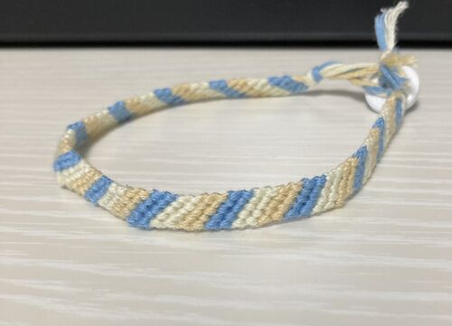 水色・オフホワイト・薄茶の3色斜め編みのミサンガを作りました。100円ショップ、キャンドゥの糸です。今回は以下の動画を参考にしました。今まで動画を観てきた中で、一番わかりやすかったです。 youtu.be 【感想】今まで派手目のものばかり作っていました…