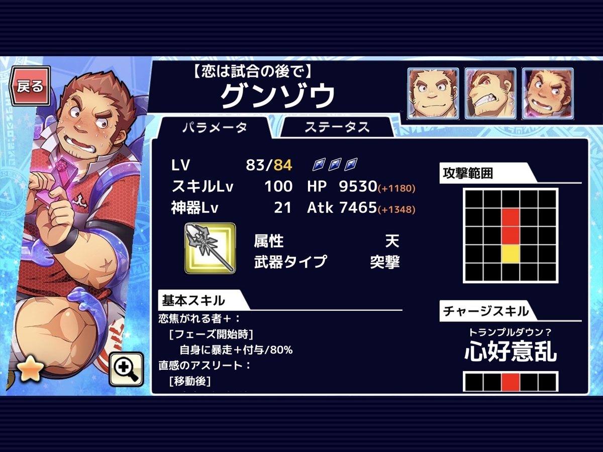 一番鍛えているのは【恋は試合の後で】グンゾウ。いわゆるバレンタイングンゾウさんです。フレンド枠で見かけてから、ずっとこのバージョンのグンゾウさんを気になっていまして、ガチャ復刻の時期に当てました。