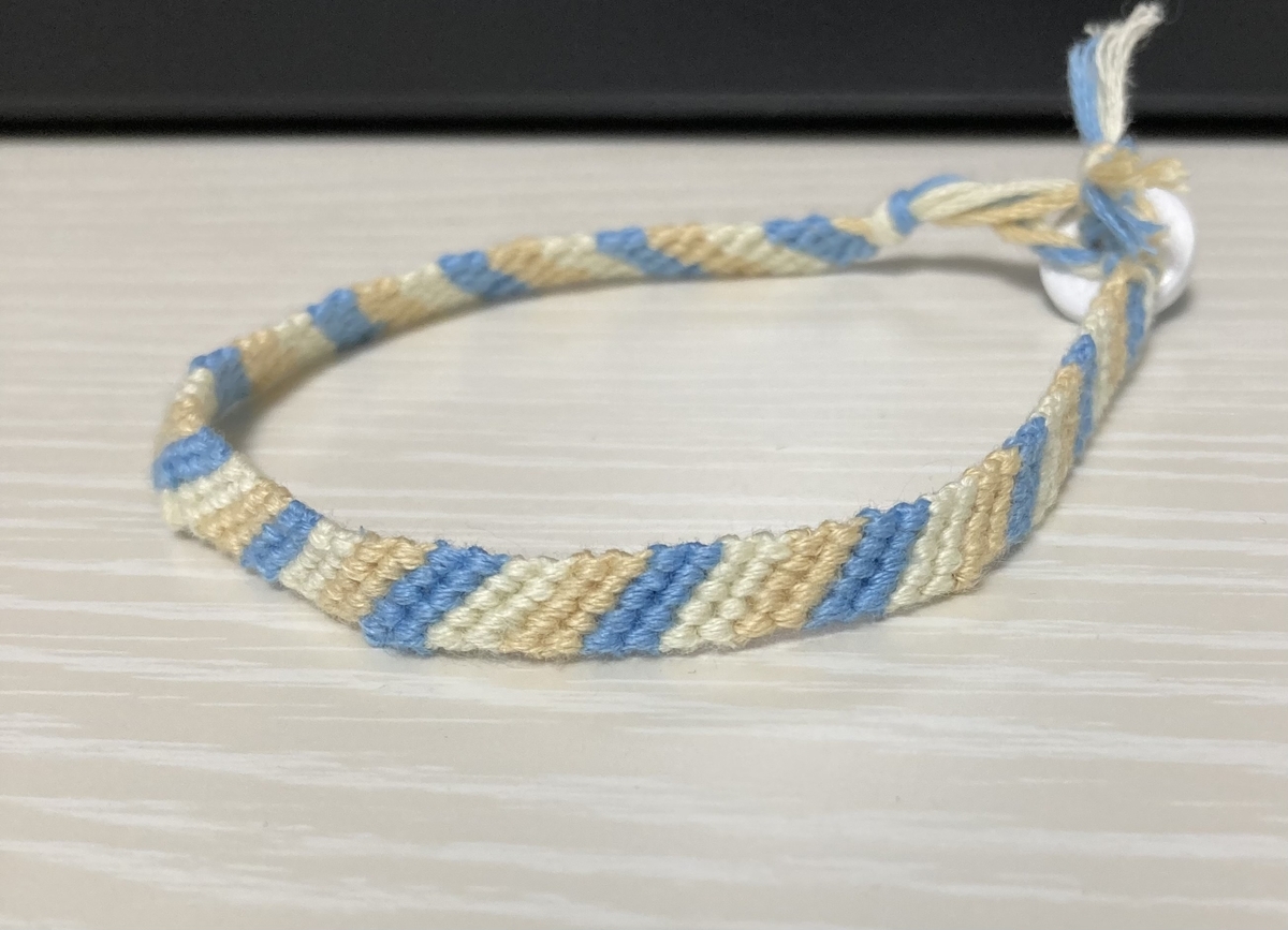 水色・オフホワイト・薄茶の3色斜め編みのミサンガを作りました。100円ショップ、キャンドゥの糸です。